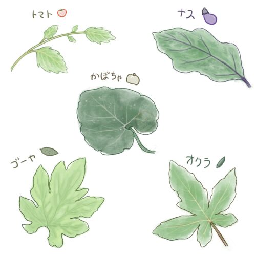 畑になっている野菜を知りたくて、夏野菜の葉っぱを描いてみました✨